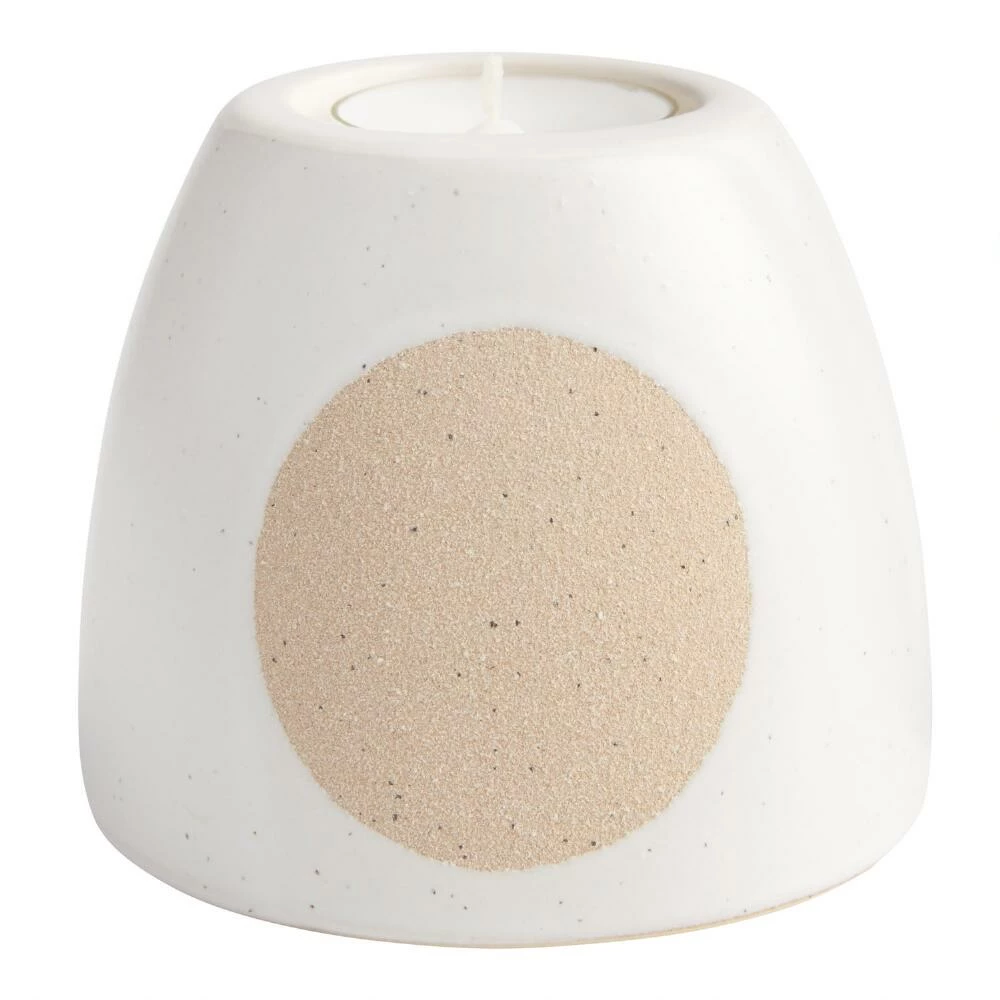 The elegantly clean form and stylish natural hues of our exclusive tealight candle holder imbue your space with a chic, modern-minimalist vibe. Crafted from ceramic with a white glaze, it features a simple circular design of unfinished ceramic bisque highlighted by its soft terracotta tones.