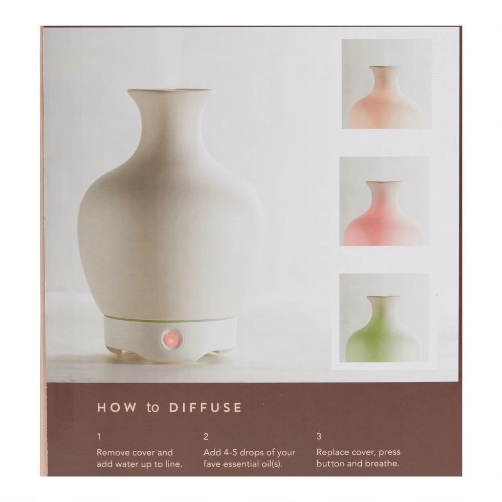 Designed to be used with our Apothecary diffuser oils or your favorite essential oils, this ultrasonic diffuser creates lightly scented mist throughout your space. Simply fill it with water and add a few drops of your favorite scent to set the mood. While in use the silent diffuser glows softly with multiple light settings for a subtle lamp effect.