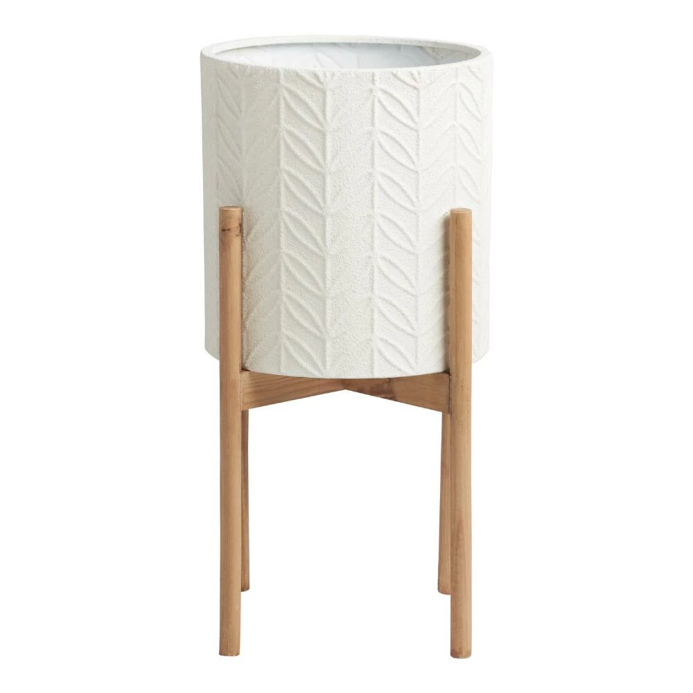 With its streamlined form and sprayed, white stone-like finish across an embossed leaf design, our medium lightweight planter possesses a modern sensibility. You can use it with or without the included natural-pinewood stand and let your creative eye achieve the perfect greenery aesthetic for your home decor.