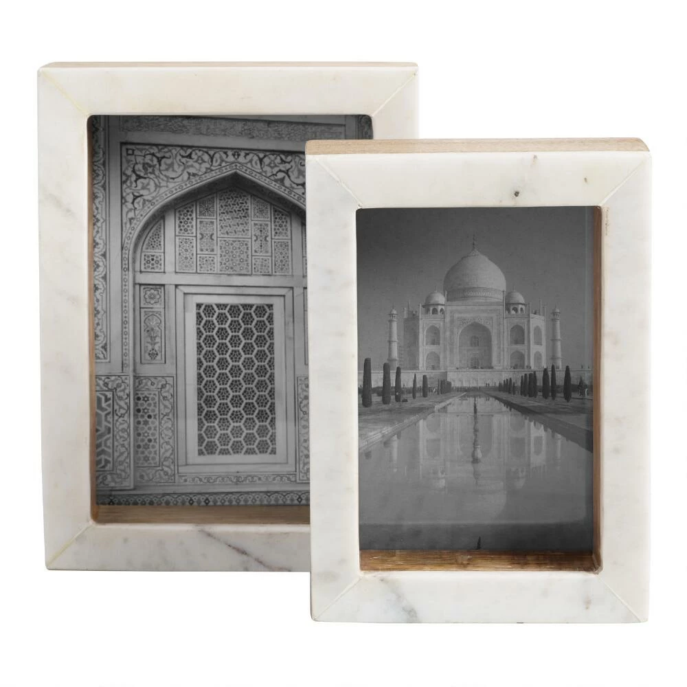 Our free-standing frames showcase your photos with sophisticated shadowbox-style borders crafted of smooth, luminous white marble with wood backing. Available in two sizes, these frames bring a sense of grace and luster to your precious memories.