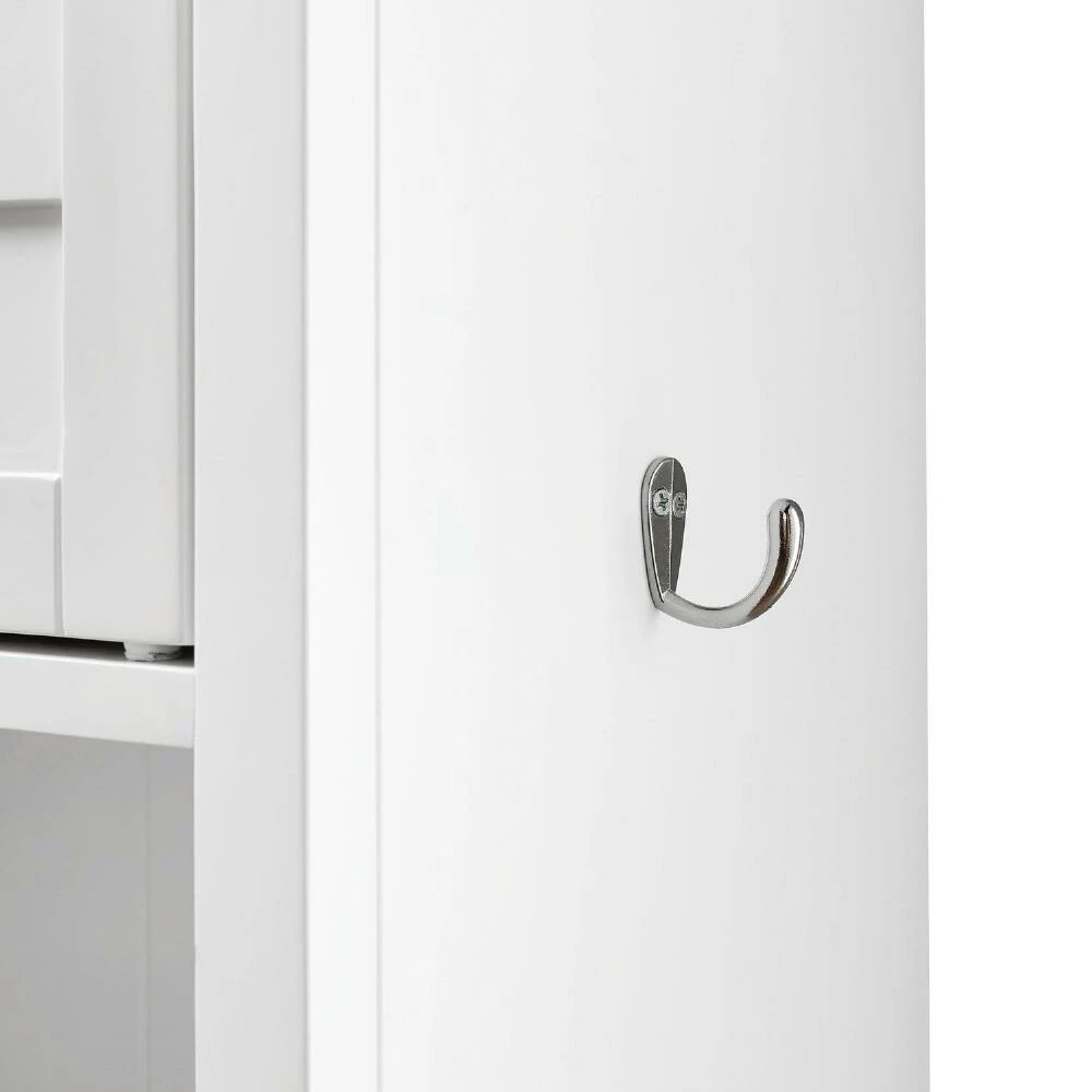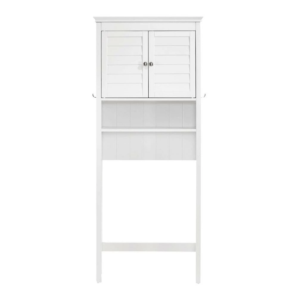 Featuring a shelf, a cabinet and towel hooks on each side, our cabinet uses the space above the toilet tank to maximize your storage options. Louvered doors create a classic look that works with a range of decor styles.